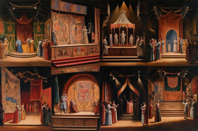 Durante il Medioevo, le rappresentazioni teatrali si spostano principalmente in ambienti religiosi e spazi pubblici. Le scenografie erano spesso semplici, costituite da palchi multipli chiamati mansions, che rappresentavano luoghi diversi contemporaneamente, con un forte simbolismo religioso.